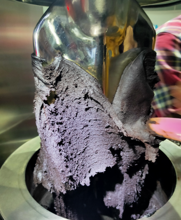 物料呈高粘度的膏體狀,第一代就是靠人工棒打,截至目前更新代換也是先用密煉機攪拌,攪拌之后在用壓面機來(lái)回碾壓。立式捏合機的捏合功能剛好代替兩種,經(jīng)過(guò)捏合實(shí)驗,客戶(hù)成型的產(chǎn)品效果相當好。如此粘度之高的物料,擠壓出料干凈幾乎無(wú)殘留讓客戶(hù)甚是滿(mǎn)意,生產(chǎn)直接提高60%效率。